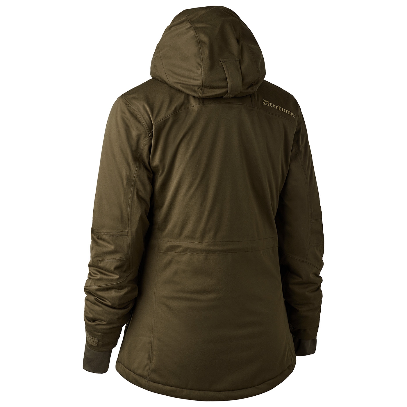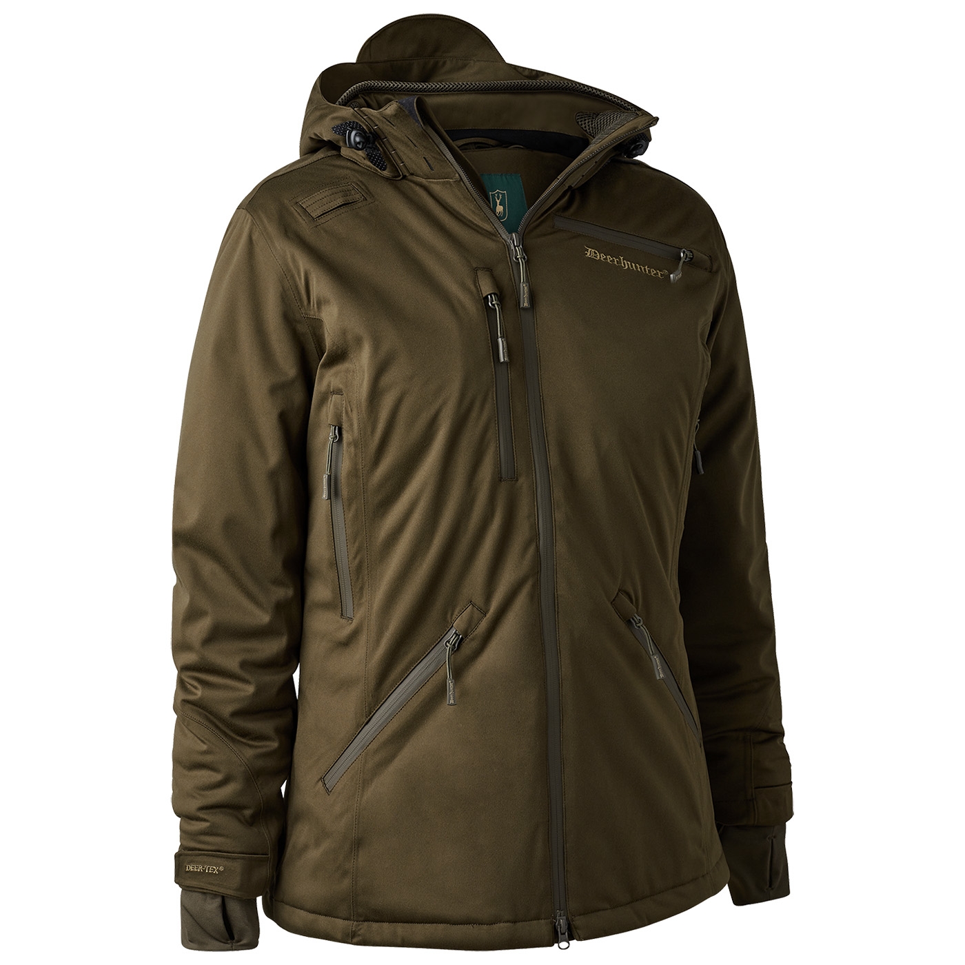 Het Lady Excape winterjack van Deerhunter biedt alles wat u zich kunt wensen in een lichtgewicht, ademend en volledig geïsoleerd jack - van de afneembare capuchon tot het verborgen gezichtsmasker in de kraag en de extra vulling op de rug om warmteverlies te voorkomen als de jachtdag 's ochtends begint met ijzige temperaturen. De 2-way stretch zorgt voor bewegingsvrijheid, terwijl het Deer-Tex® Performance Shell membraan lichtgewicht en 100% waterdicht is. Dit functionele jack heeft ook waterdichte ritsen voor de radiozak, de borstzak, de 2 voorzakken, de 2 handwarmerzakken en de centrale YKK tweewegritssluiting, het heeft ook 2 binnenzakken en biedt zo voldoende opbergruimte voor alle belangrijke gebruiksvoorwerpen. De verstelbare manchetten en een verstelbaar trekkoord aan de onderkant van de jas zorgen voor een echt op maat gemaakte, comfortabele pasvorm. De jas is ook voorzien van ventilatiesleuven. Hierdoor is de jas zelfs bestand tegen de zwaarste weersomstandigheden. De EXCAPE-collectie is geschikt voor alle seizoenen en kan in lagen worden gedragen, afhankelijk van het type en de stijl van jagen.