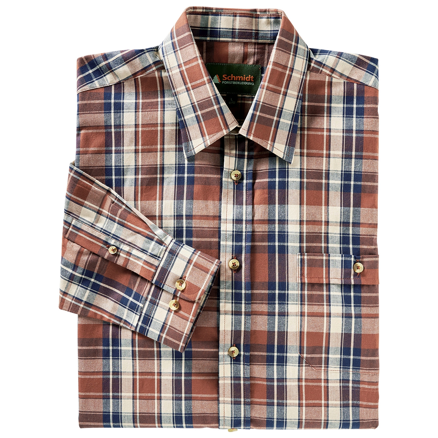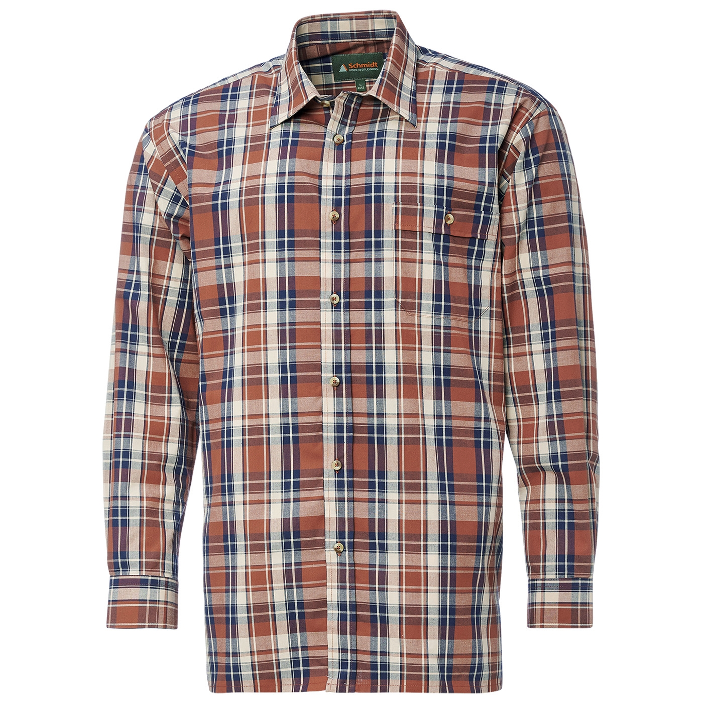 Klassiek geruit overhemd van Schmidt met een omgeslagen kraag - de perfecte metgezel voor je volgende buitenavontuur of jachttrip. Gemaakt van huidvriendelijk katoen is dit overhemd extreem comfortabel om te dragen, zelfs voor langere buitenactiviteiten. De comfortabele wijdte en optimale ruglengte zorgen voor een ideale pasvorm. De doorlopende knoopsluiting is afgewerkt met stijlvolle knopen in een natuurlijke look, en er is ook een praktische borstzak links met knoopsluiting voor extra opbergruimte voor kleine spullen. Of je nu gaat stalken of wandelen - met dit geruite overhemd ben je altijd goed uitgerust.
