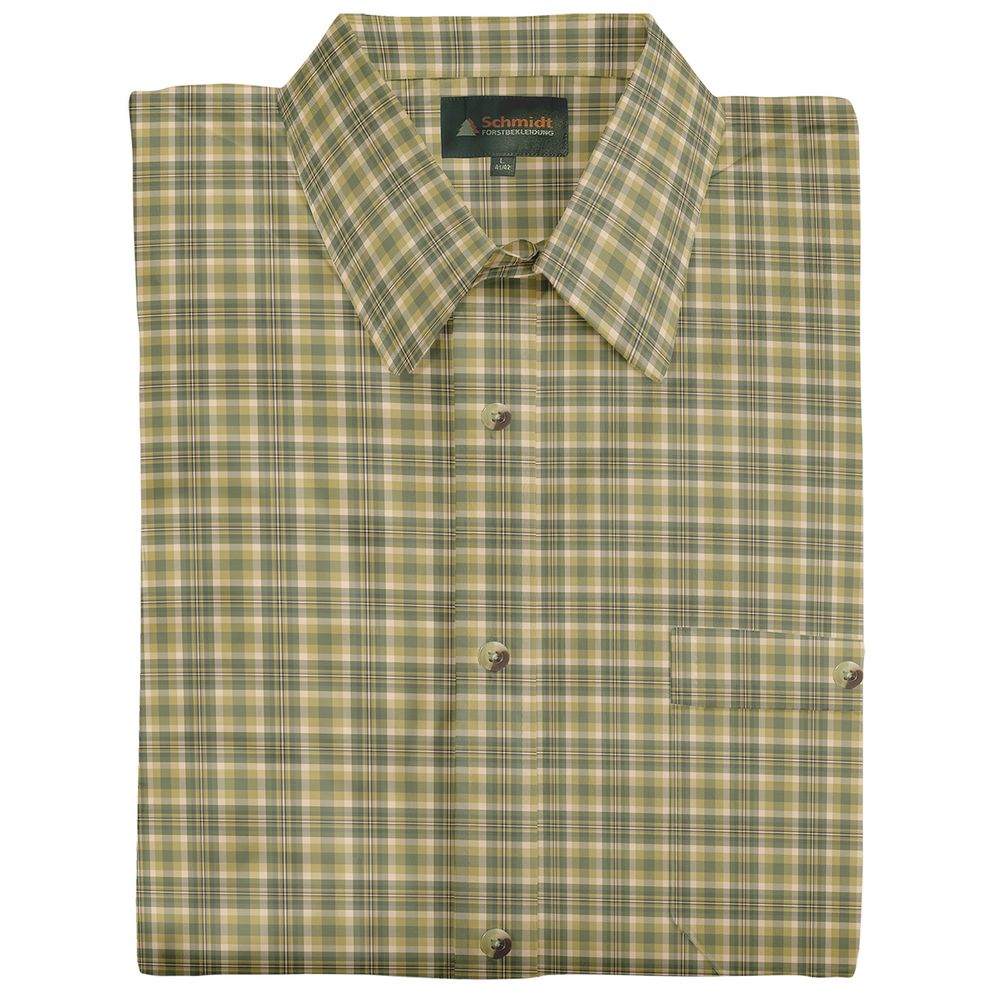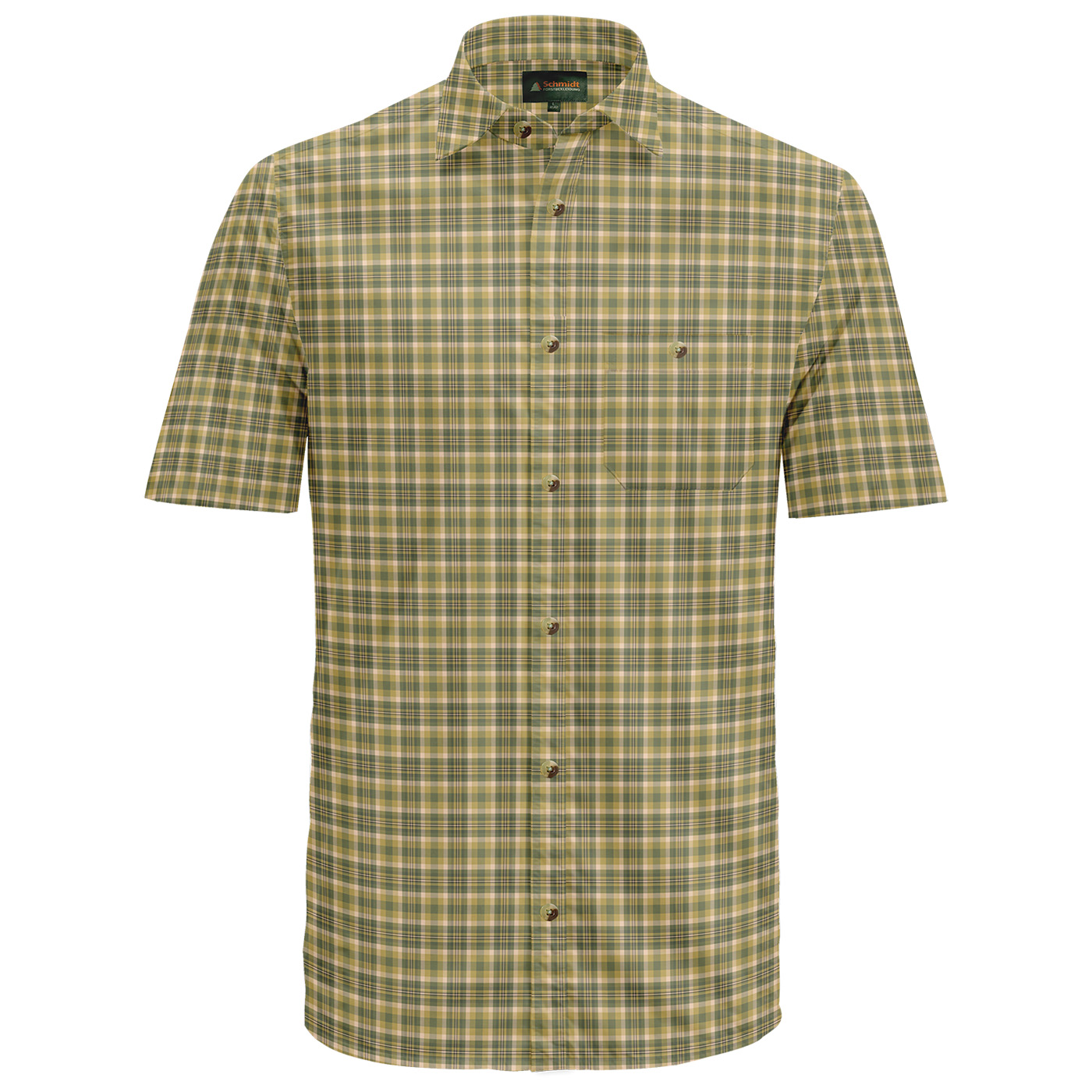 Klassiek geruit overhemd van Schmidt met korte mouwen en omgeslagen kraag - de perfecte metgezel voor je volgende buitenavontuur of jachttrip. Gemaakt van huidvriendelijk katoen is dit overhemd extreem comfortabel om te dragen, zelfs voor langere buitenactiviteiten. De comfortabele wijdte en optimale ruglengte zorgen voor een ideale pasvorm. De doorlopende knoopsluiting is afgewerkt met stijlvolle knopen in een natuurlijke look, en er is ook een praktische borstzak links met knoopsluiting voor extra opbergruimte voor kleine spullen. Of je nu gaat stalken of wandelen - met dit geruite overhemd ben je altijd goed uitgerust.
