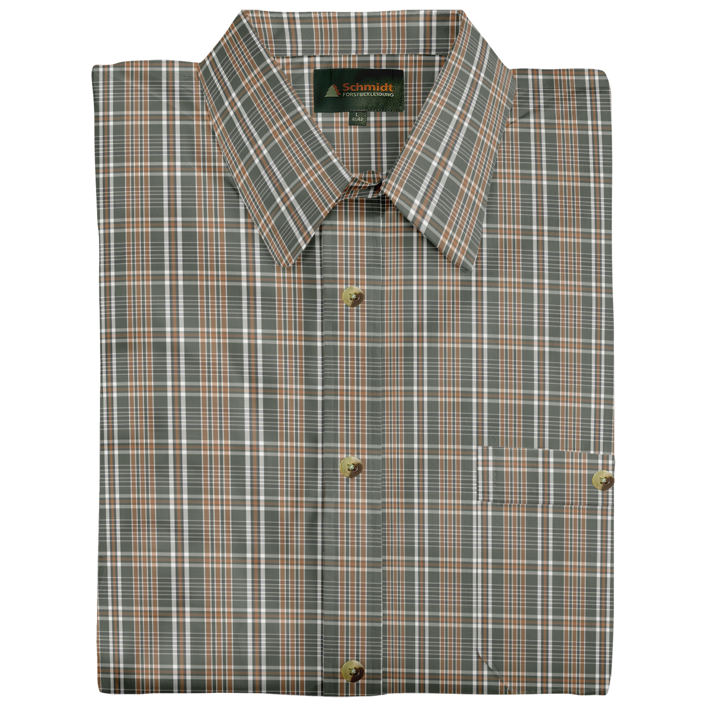 Klassiek geruit overhemd van Schmidt met korte mouwen en omgeslagen kraag - de perfecte metgezel voor je volgende buitenavontuur of jachttrip. Gemaakt van huidvriendelijk katoen is dit overhemd extreem comfortabel om te dragen, zelfs voor langere buitenactiviteiten. De comfortabele wijdte en optimale ruglengte zorgen voor een ideale pasvorm. De doorlopende knoopsluiting is afgewerkt met stijlvolle knopen in een natuurlijke look, en er is ook een praktische borstzak links met knoopsluiting voor extra opbergruimte voor kleine spullen. Of je nu gaat stalken of wandelen - met dit geruite overhemd ben je altijd goed uitgerust.