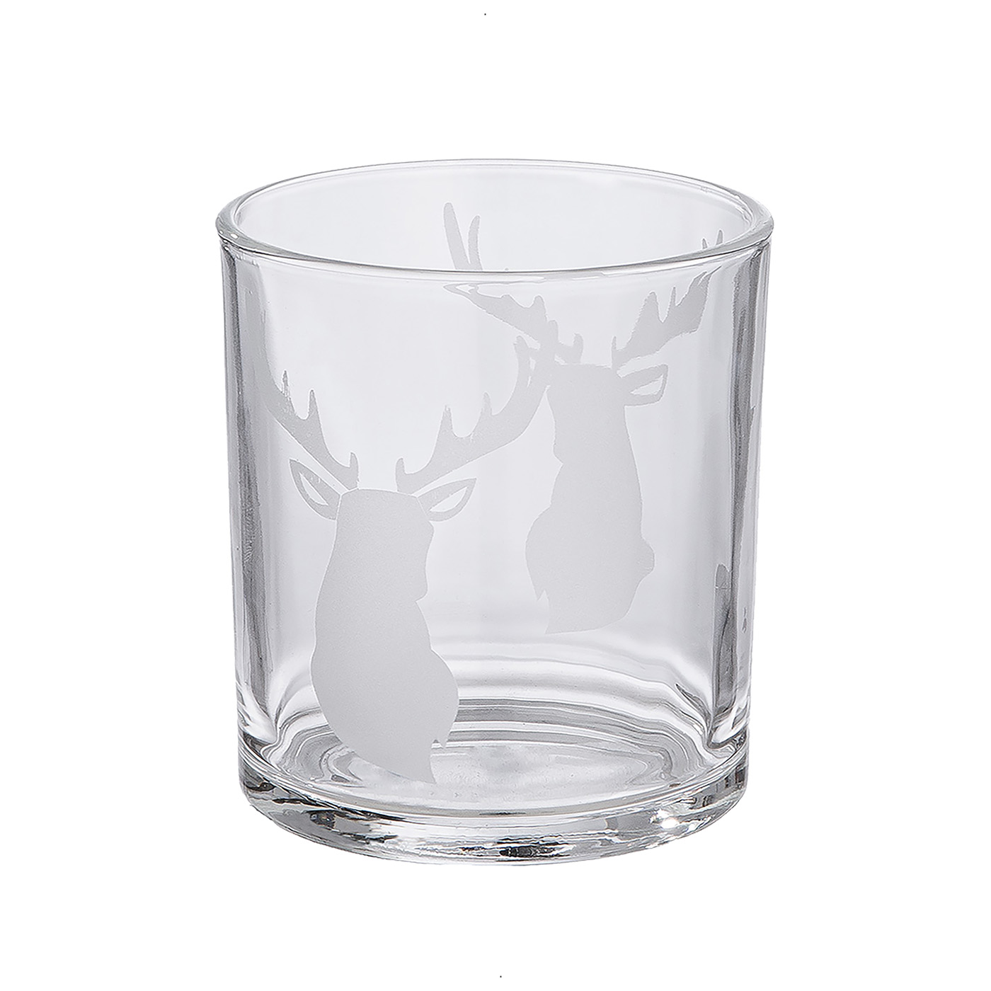 Sfeervolle, cilindervormige glazen lantaarn met aan beide kanten een gravure van een hertenkop. Hoogte 10cm, diameter 9cm.