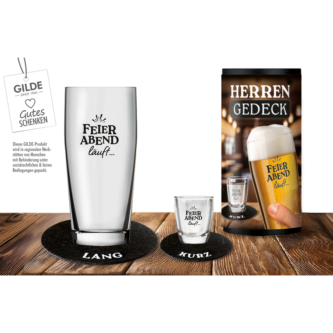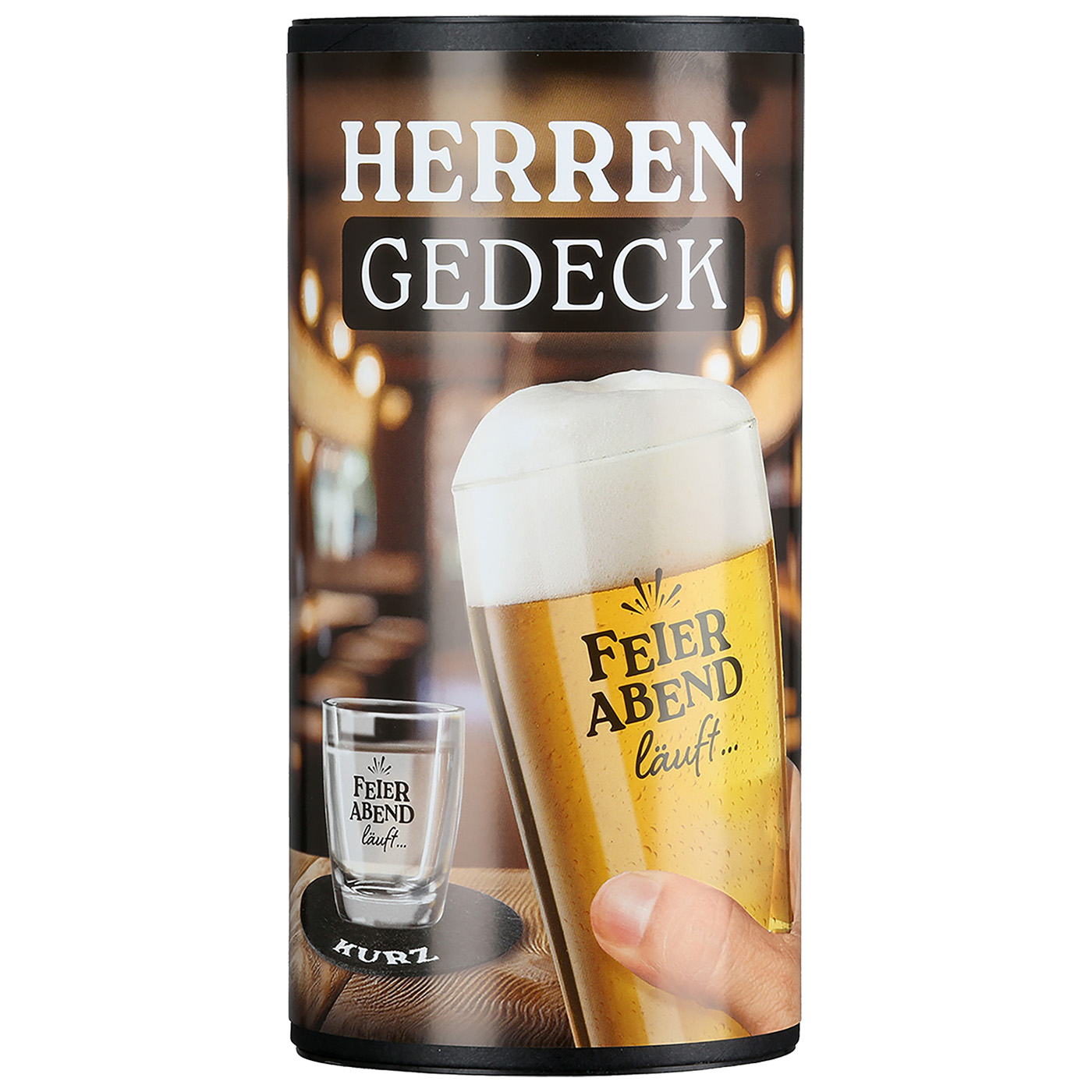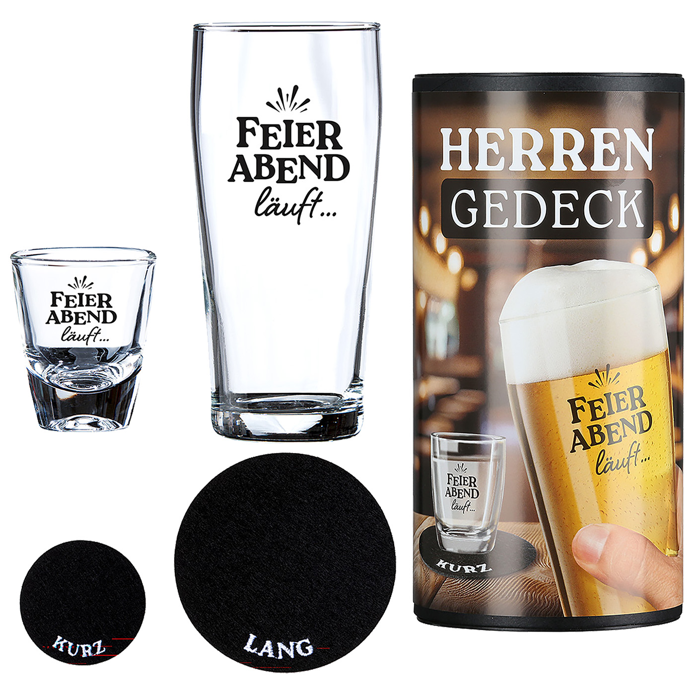 De klassieke herenset bestaat uit een biertje en een schnaps (lang/kort). Deze 4-delige set bestaande uit een "Feierabend läuft..." bierglas, in combinatie met het "Feierabend läuft..." borrelglas en bijpassende vilten onderzetters, is ideaal voor alle kenners met stijl en smaak. De twee hoogwaardige glazen zijn bedrukt en geschikt voor de vaatwasser. Het perfecte cadeau voor elke gelegenheid met een twinkeling in de ogen. Mooi verpakt in een decoratieve cilinderdoos met band H 19,5 x D 9,5 cm.