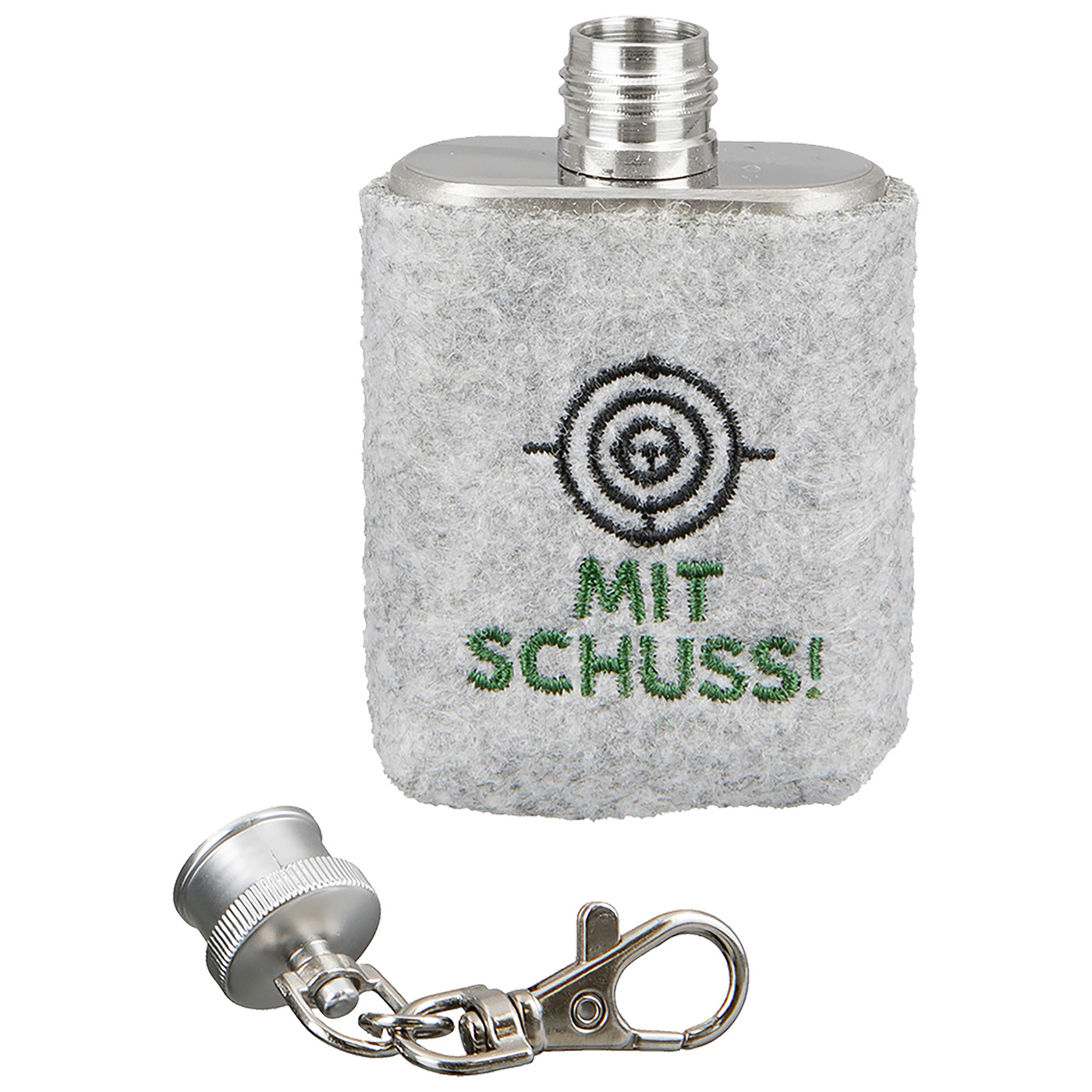 Gilde "Mit Schuss!" heupfles sleutelhanger - een stijlvol accessoire voor onderweg! De hanger is gemaakt van hoogwaardig, lichtgrijs vilt met een trendy, geborduurd motief. De heupfles, gemaakt van robuust 304 roestvrij staal, heeft een inhoud van 30 ml en siert niet alleen je sleutelbos, maar is ook een praktisch accessoire. De Gilde heupfles sleutelhanger is het ideale cadeau voor kenners met stijl en humor! Afmetingen: 2,5x4,5x8cm (LxBxH)
