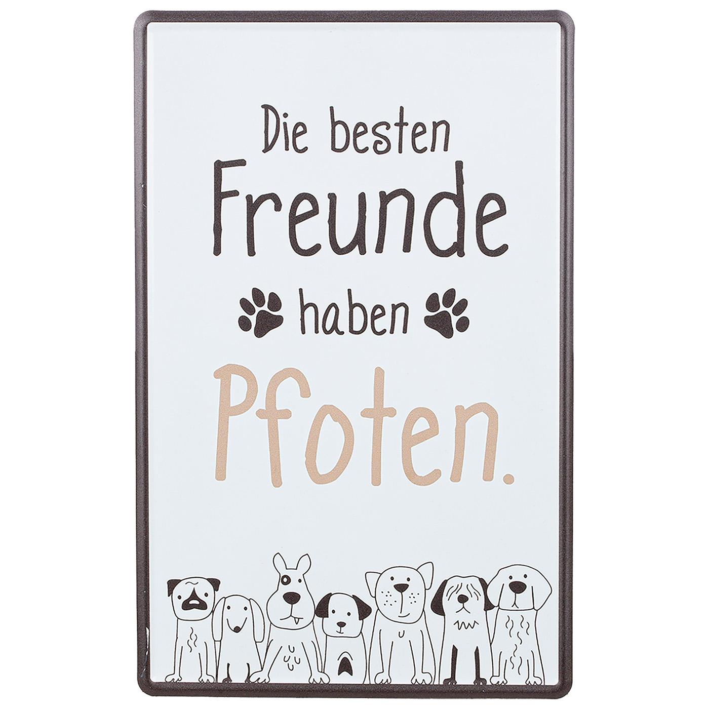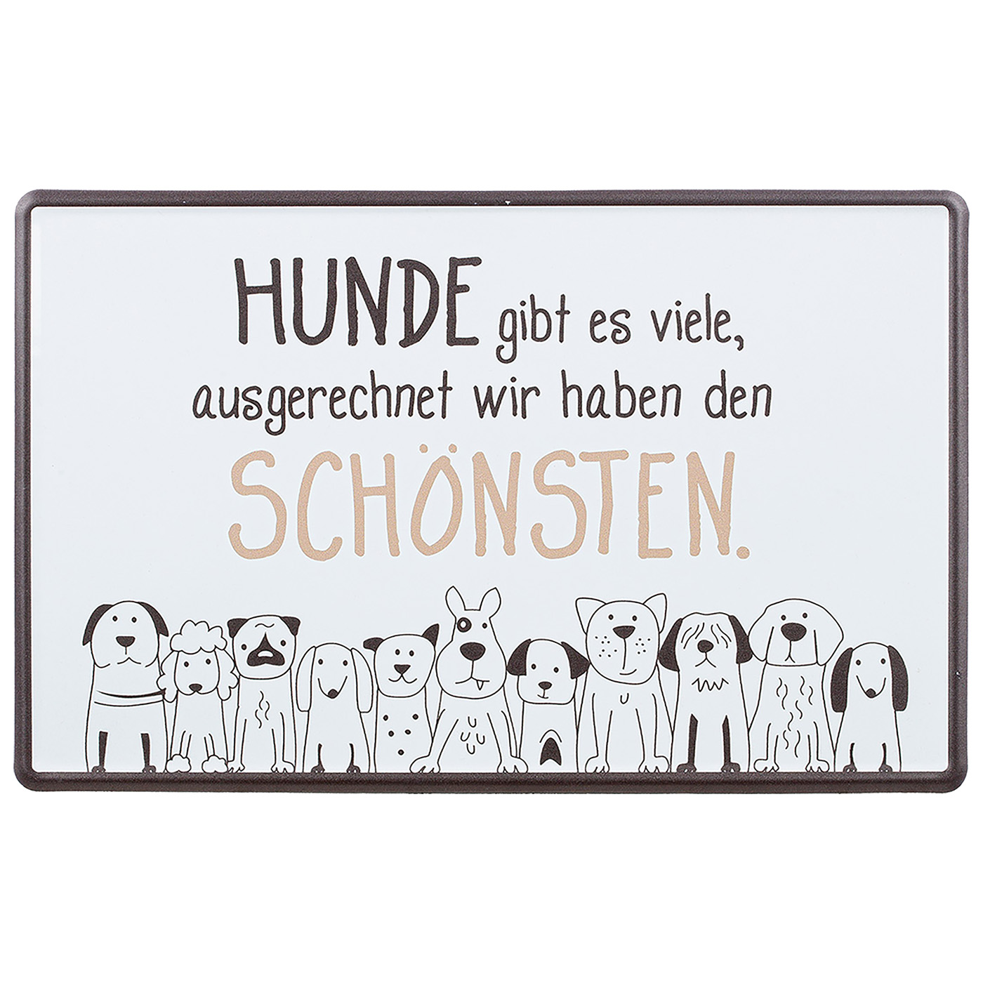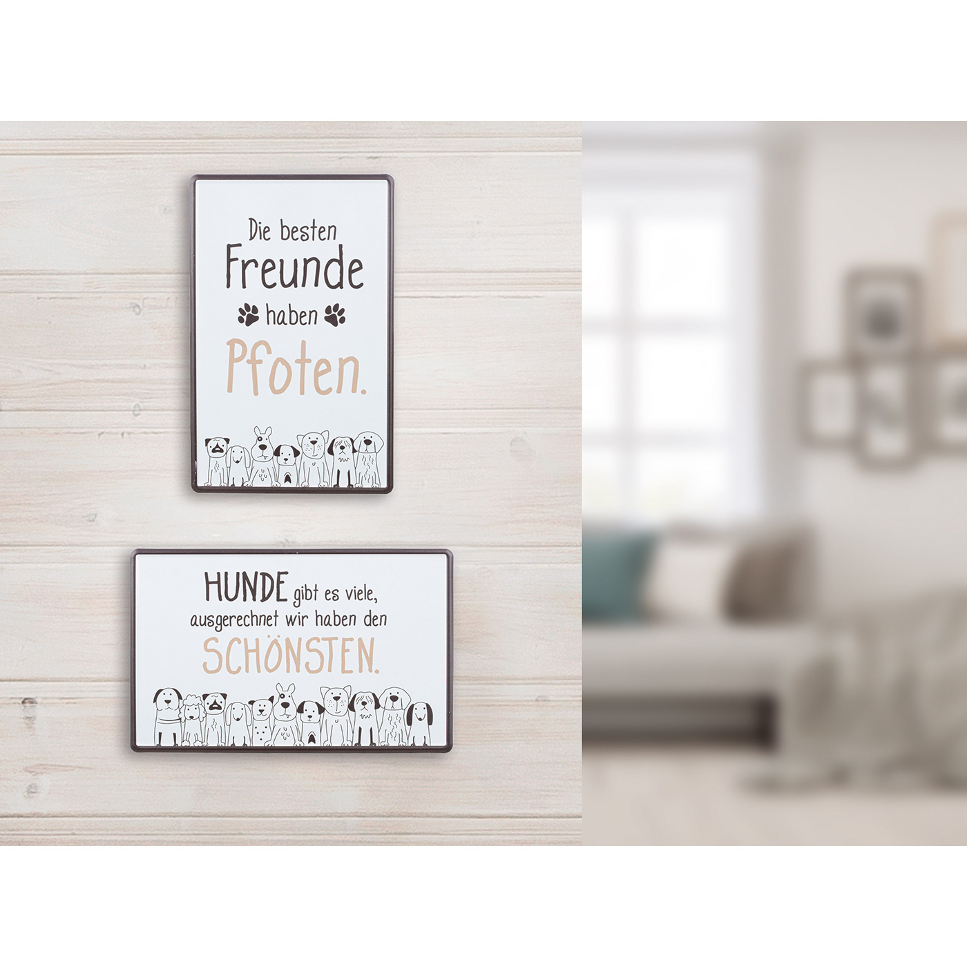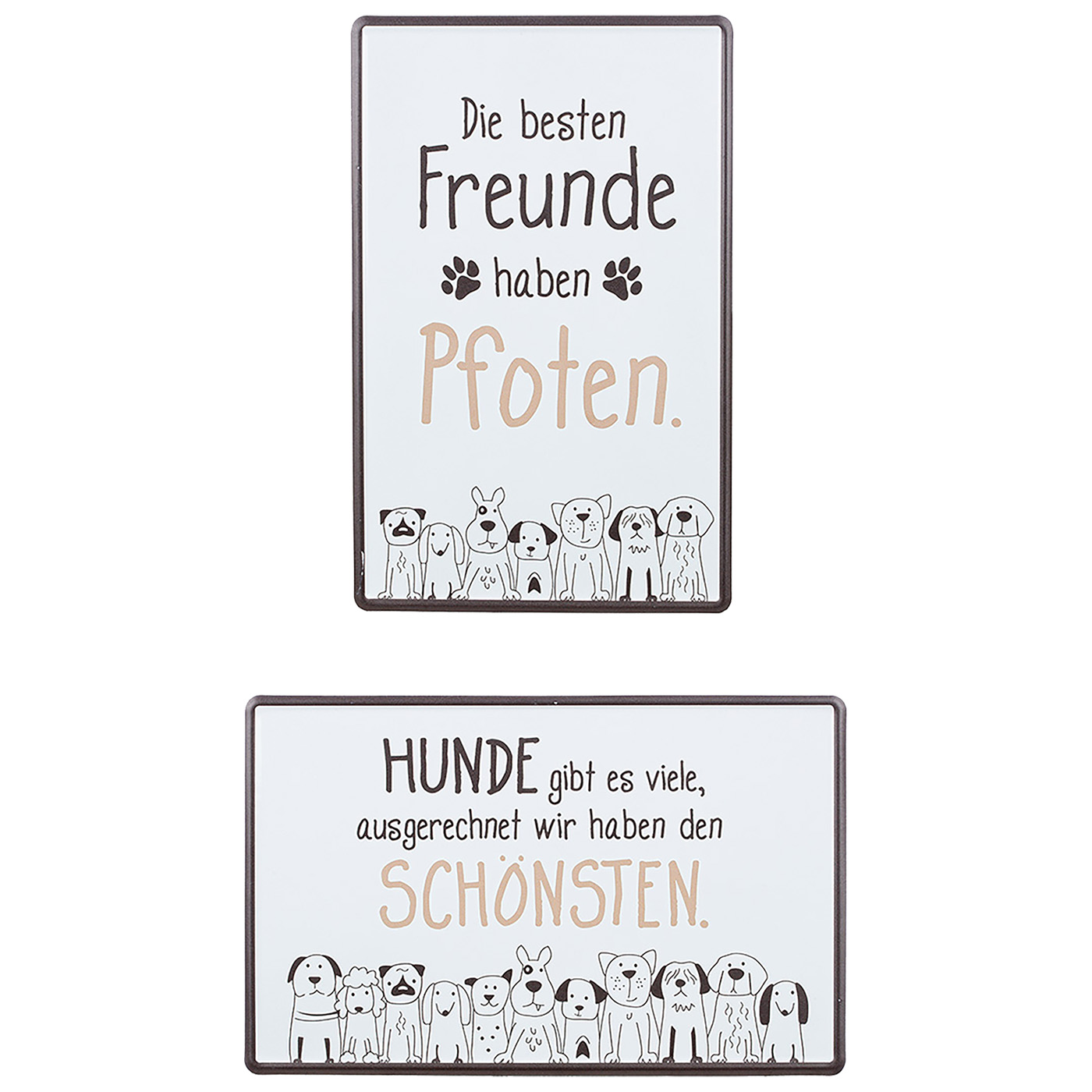 Gilde tinnen bordjes "Hondenbende", decoratief met humoristische slogan en hondentekening, gemaakt van wit metaal, 2 stuks zoals afgebeeld, 1x staand formaat, 1x liggend formaat, afmetingen: 30x19cm.