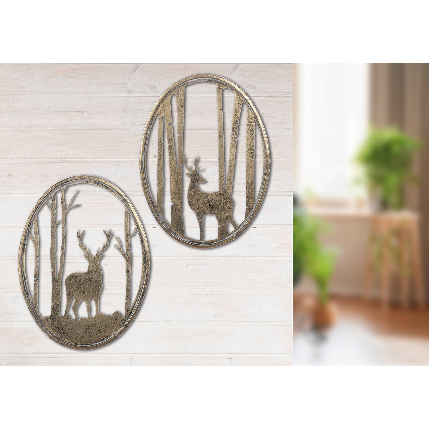 Wandreliëf, ovaal, hertenmotief in het bos van goudkleurig metaal, als set van 2, zoals afgebeeld. Afmetingen: 2 × 30,5 × 40cm