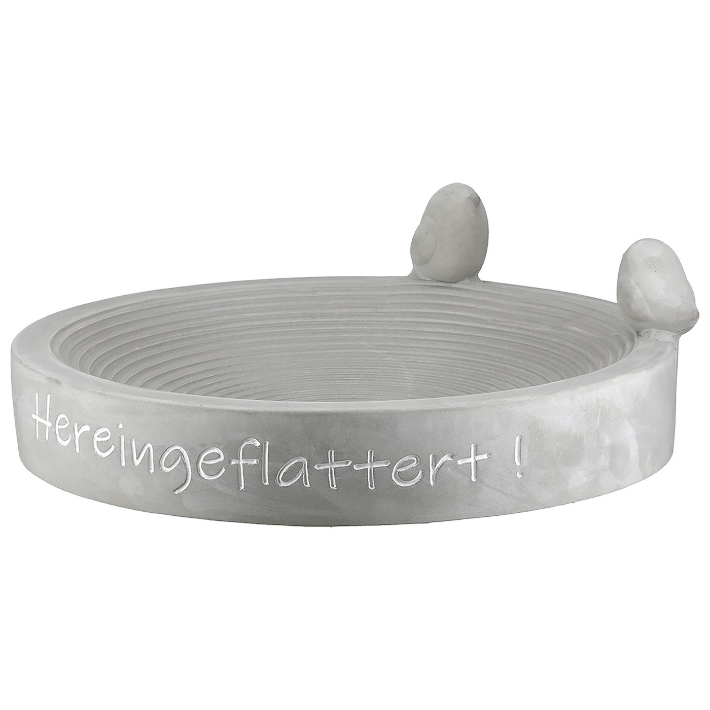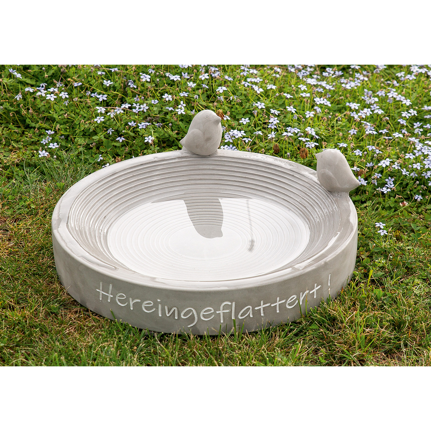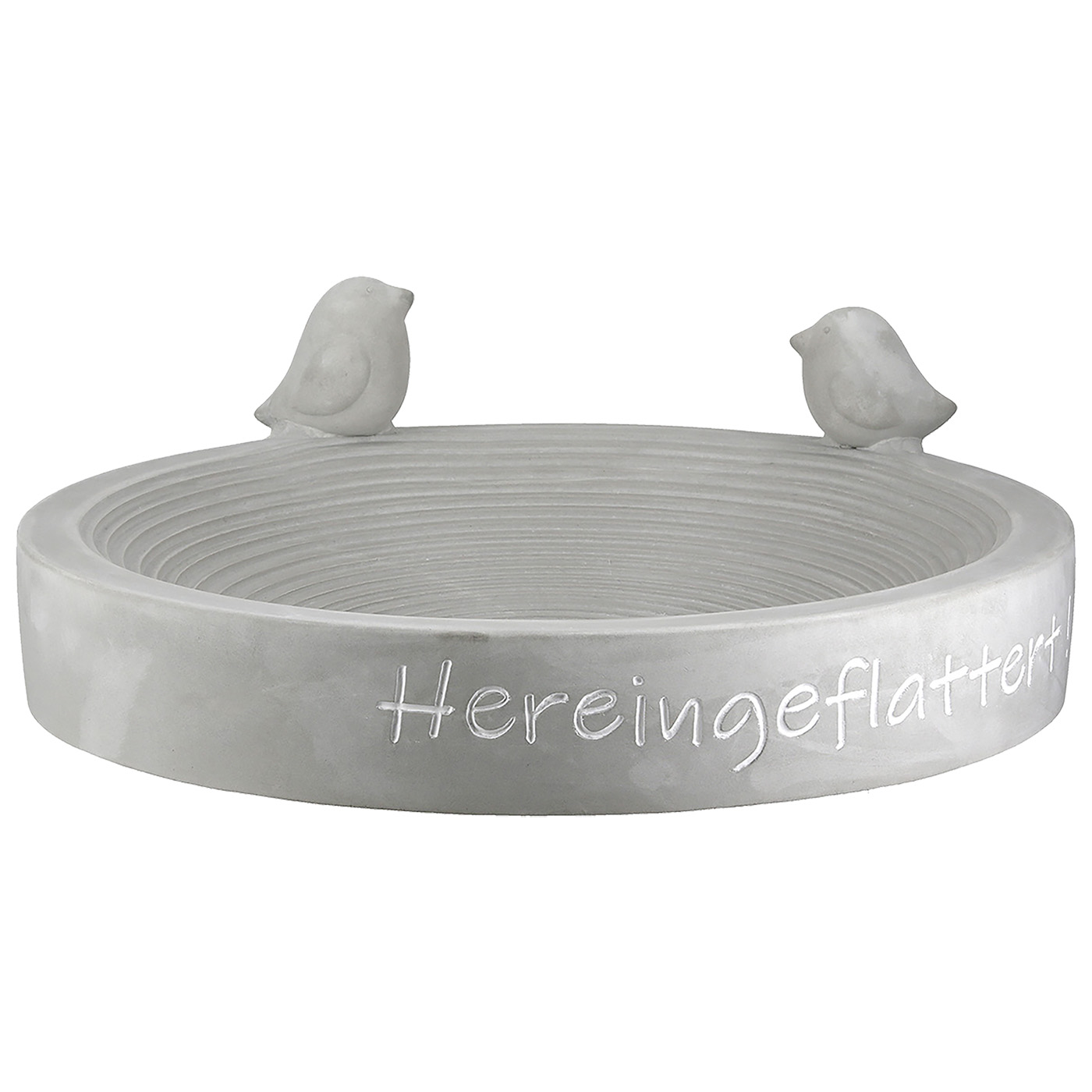 Rond vogelbad met Hereingeflattert letters en twee decoratieve vogels, uiterst decoratief en stijlvol, gemaakt van trendy cementmateriaal, afmetingen: 31 x 10 x 30 cm, gewicht: 3,51 kg