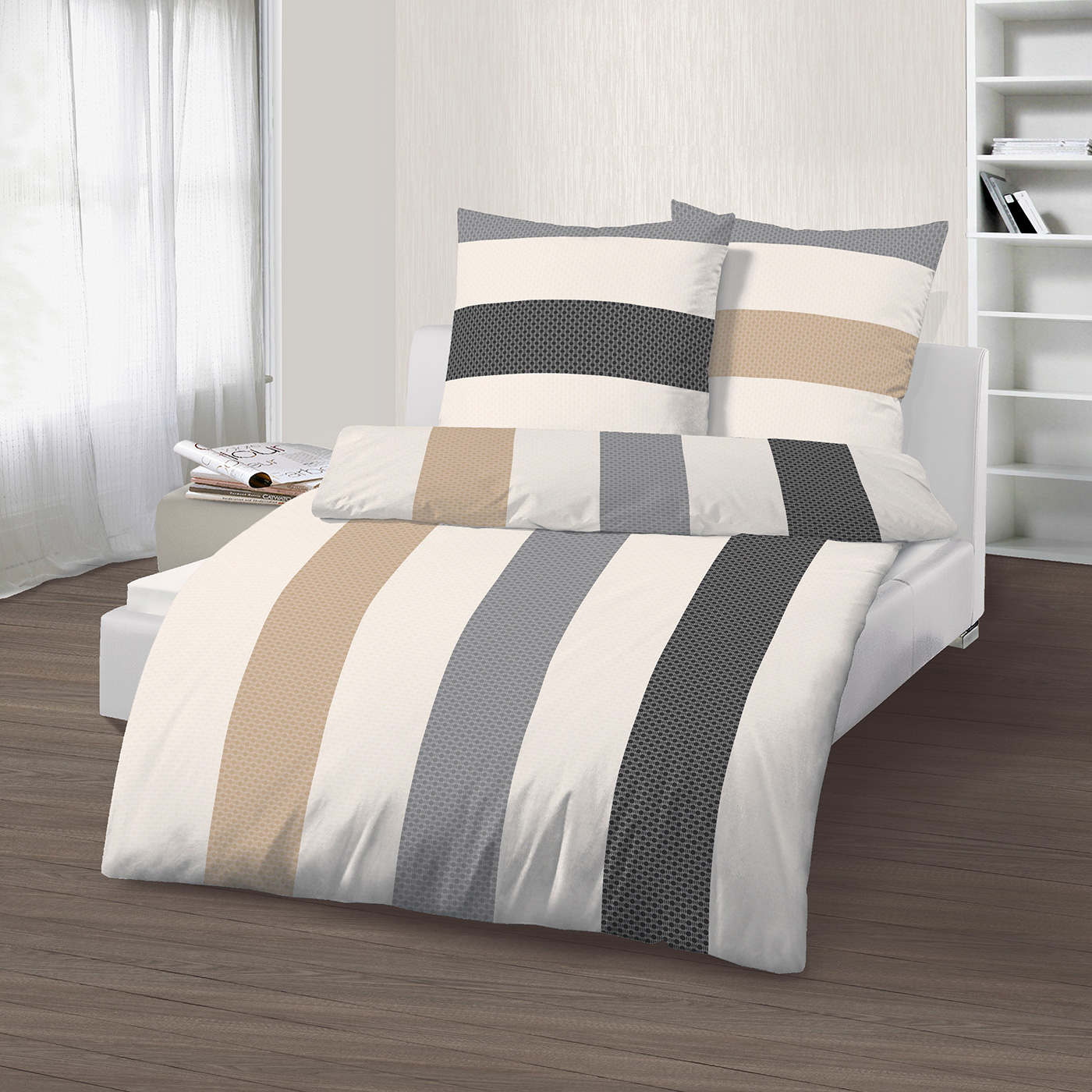 Knus, zacht en warm bever bedlinnen - het perfecte winterbedlinnen voor koude nachten. Dit beddengoed van hoge kwaliteit biedt niet alleen uitstekend slaapcomfort, maar heeft ook een temperatuurregulerende werking. Het is bijzonder huidvriendelijk en behaaglijk, waardoor het de ideale keuze is voor je dekbed en kussen. Dit gesanforiseerde winter bedlinnen maakt indruk met zijn moderne kleine patroon in een gestreept design. Het dekbedovertrek meet ca. 155 x 220 cm en de kussensloop ca. 80 x 80 cm, perfect voor een knus bed. Gemaakt van 100% katoen (20% gerecycled), biedt dit beddengoed niet alleen comfort maar ook duurzaamheid. Gemakkelijk te gebruiken met ritssluiting. Vervaardigd volgens OEKO-TEX Standaard 100, wasbaar op 60°C, geschikt voor de droger (fijnwasprogramma).
