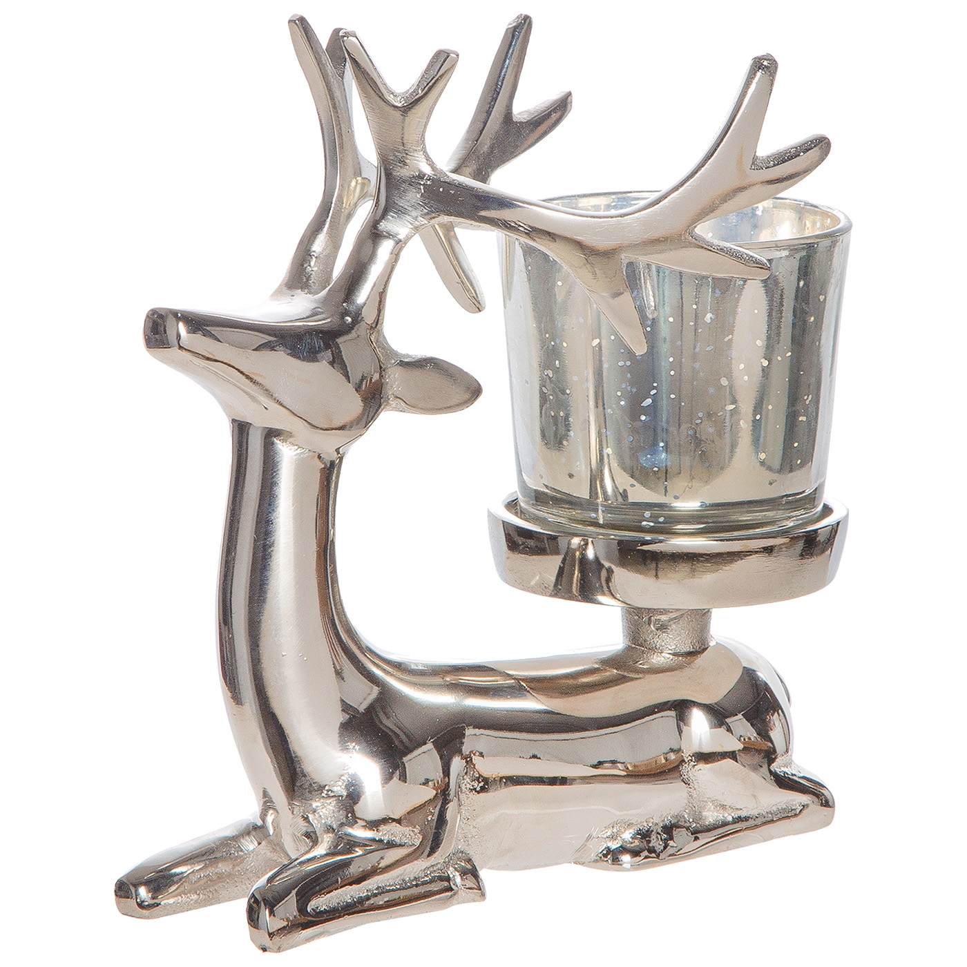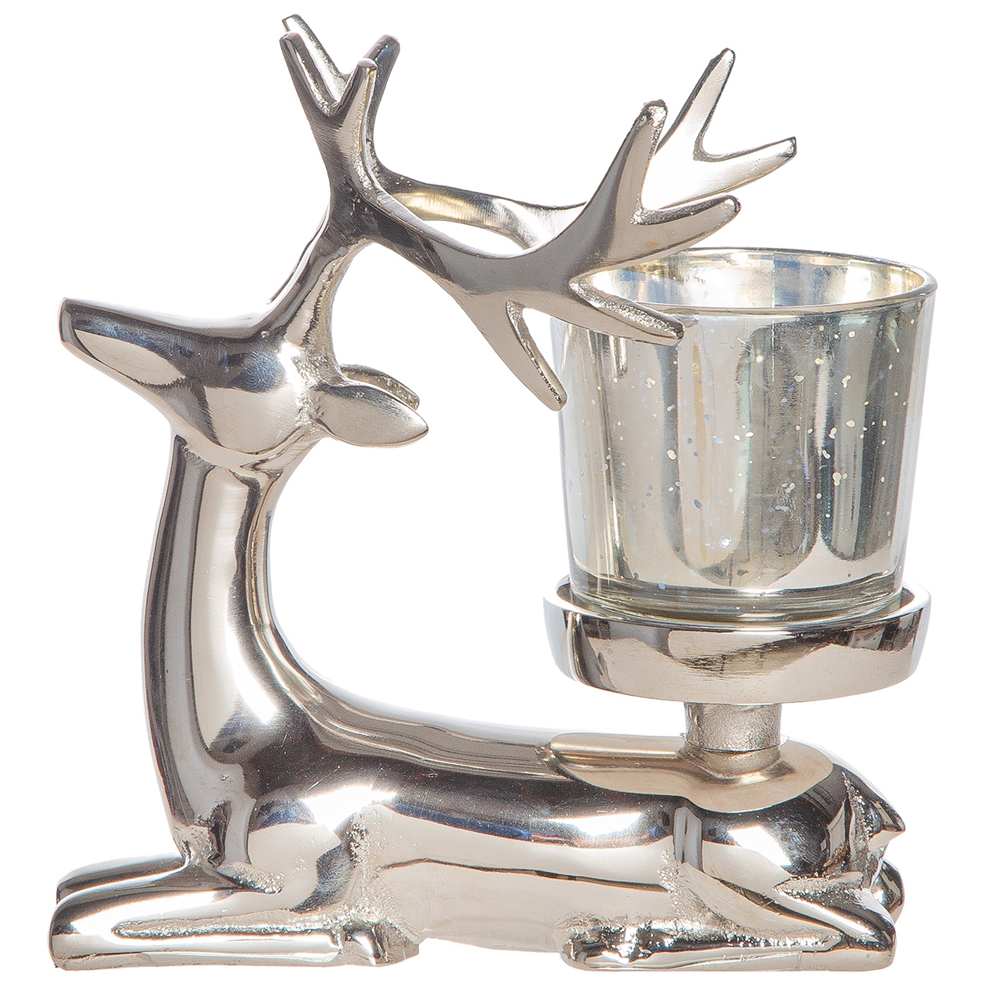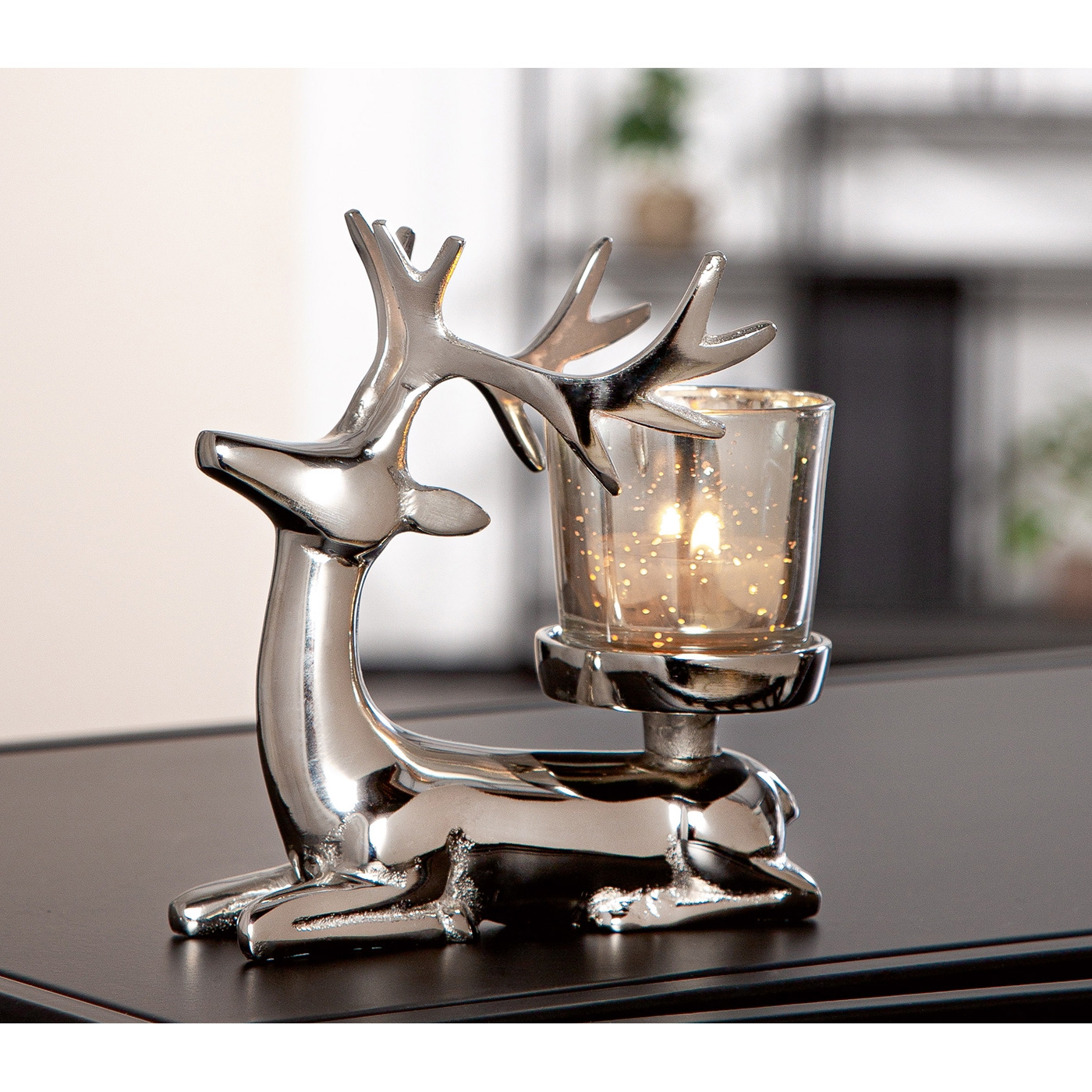 Stijlvolle waxinelichthouder, liggend hert "Aksel", in zilver, glanzend, gemaakt van aluminium, met glazen inzetstuk (Ø 6 cm, hoogte 5,5 cm) - ideaal voor een gezellige sfeer in het koude seizoen. Afmetingen: L 8 x B 13,5 x H 14 cm. Een waxinelichtje is niet inbegrepen.