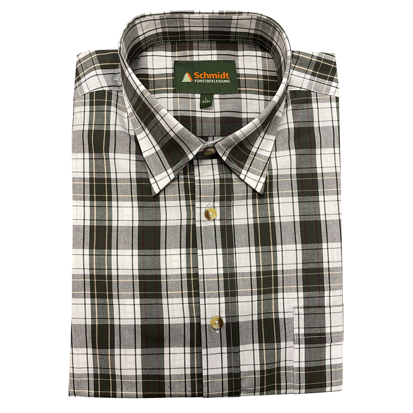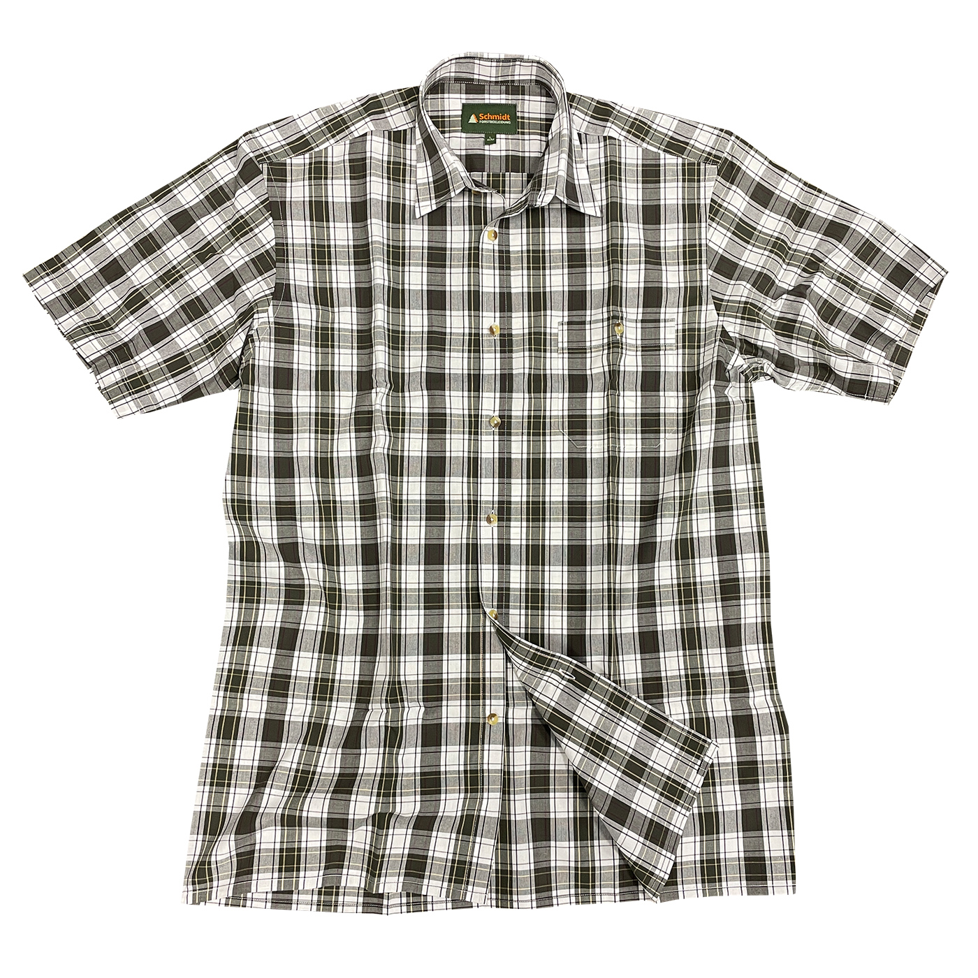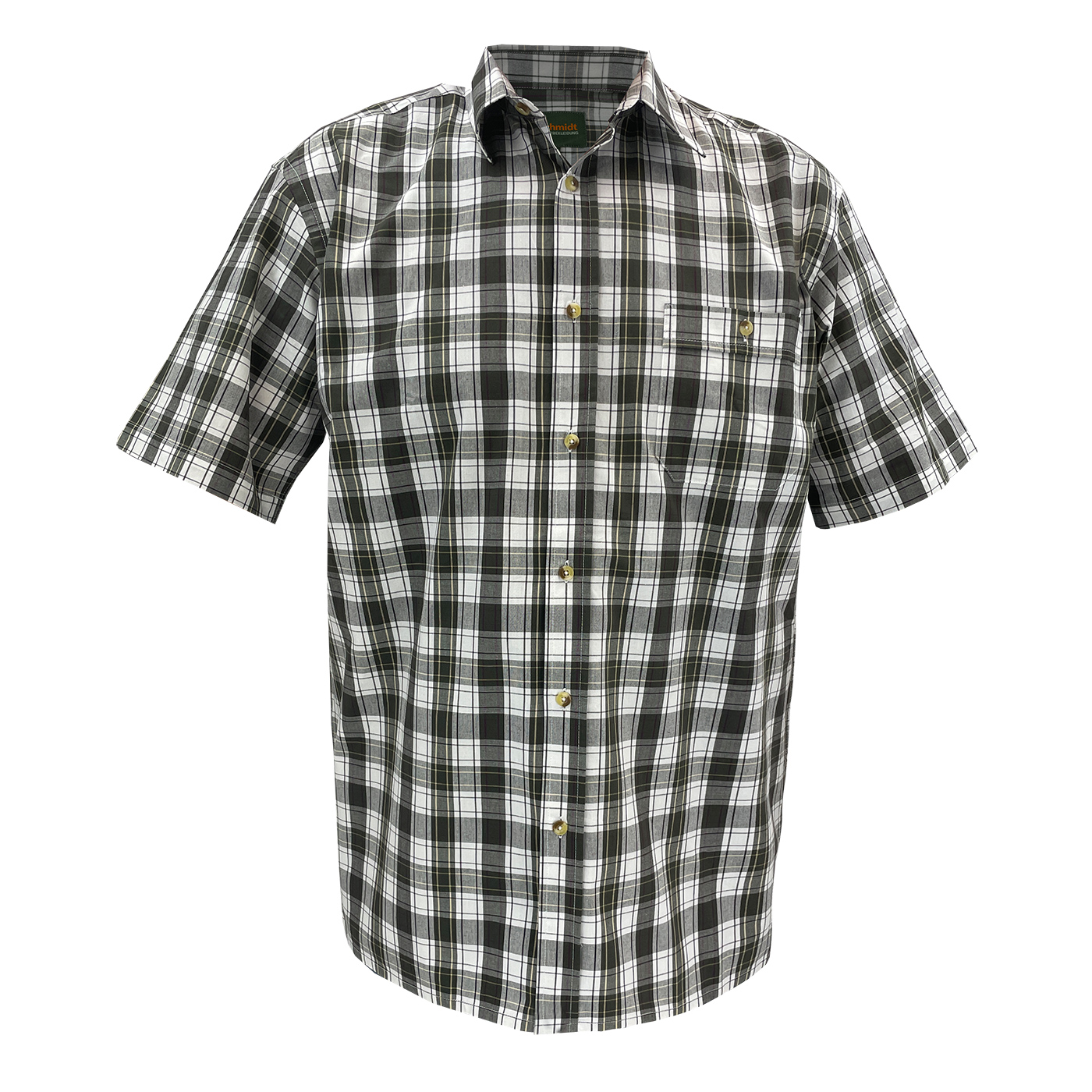 Klassisches Kurzarm-Karohemd von Schmidt mit Umlegekragen – der perfekte Begleiter für Ihr nächstes Outdoor-Abenteuer oder den Jagdausflug. Hergestellt aus hautsympathischer Baumwolle bietet dieses Hemd höchsten Tragekomfort, selbst bei längeren Einsätzen im Freien. Die bequeme Weite und die optimale Rückenlänge sorgen für eine ideale Passform. Die durchgehende Knopfleiste ist mit stilvollen Knöpfen in Naturoptik versehen, zudem gibt es links eine praktische Brusttasche mit Knopfverschluss für zusätzlichen Stauraum von kleinen Utensilien. Ob auf der Pirsch oder beim Wandern – mit diesem Karohemd sind Sie immer gut ausgestattet.