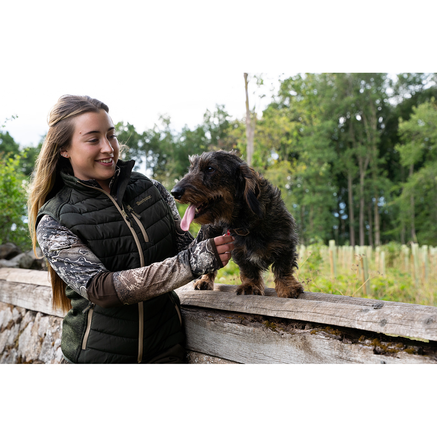 Het gewatteerde Lady Moor gewatteerde jack met gebreide fleece inzetstukken biedt lichtgewicht warmte, bewegingsvrijheid en een flatterende pasvorm voor actieve buitenactiviteiten. Met DEER-TEX® Temp padding, verwarmt het comfortabel op koele dagen. De voering en isolatie zijn ontworpen om het lichaam warm te houden zodat je niet bevriest en zorgen voor een constante lichaamstemperatuur gedurende de dag. De gebreide inzetstukken aan de zijkanten, schouders en mouwen verbeteren de beweeglijkheid en creëren een vrouwelijk silhouet. Elastische manchetten en zoom houden de warmte binnen. Een verticale borstzak en 2 voorzakken met ritssluiting bieden praktische opbergruimte. Ideaal voor laagjes of onder een buitenlaag - een veelzijdige metgezel voor de jacht en het dagelijks leven.