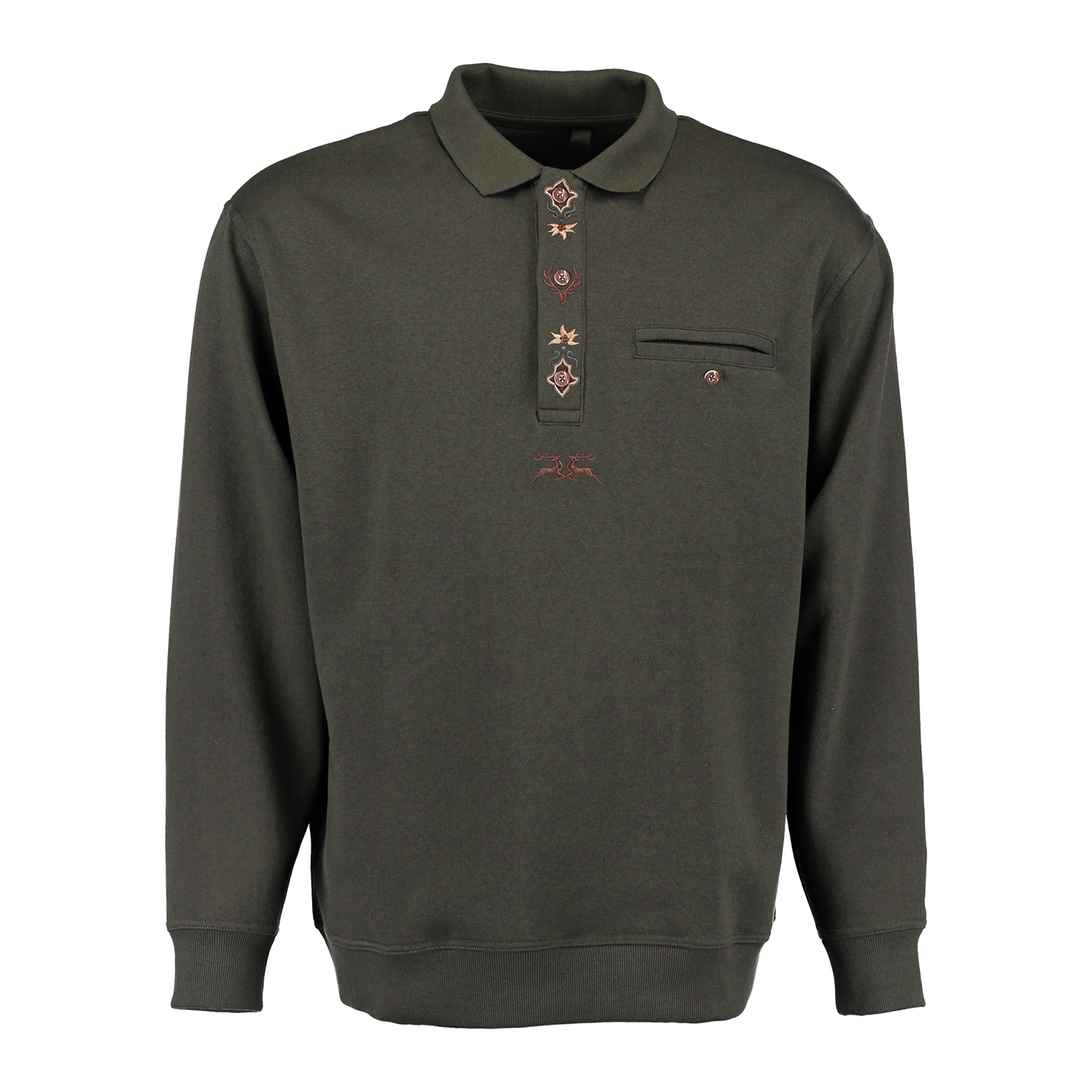 Sweatshirt mit Polokragen mit toller Stickerei. Eine Brusttasche links mit Knopf in Hirschhornoptik verschließbar. Ärmelbündchen und Bund sind angenehm dehnbar.